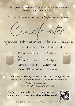 I am hosting two special Christmas candlelit Pilates sessions at the Folk Hall in Portishead to raise funds for Overcoming MS.