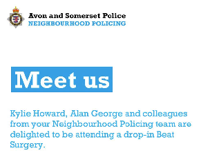 Chance to meet Kylie Howard your local PSCO, Alan George a local Councillor and colleagues of Avon and Somerset Police at a Beat Surgery. Come along and visit to find out about the work the Police are doing locally, ask questions and raise any issues concerning you.