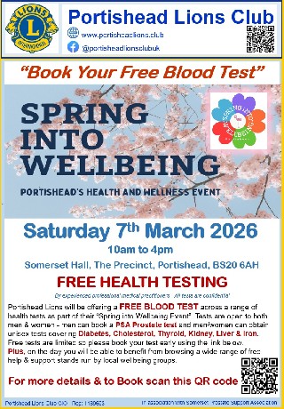 Portishead Lions will be offering a FREE BLOOD TEST across a range of health tests as part of their “Spring into Wellbeing Event”. Tests are open to both men & women - men can book a PSA Prostate test and men/women can obtain unisex tests covering Diabetes, Cholesterol, Thyroid, Kidney, Liver & Iron. Free tests are limited so please book your test early using the link below.